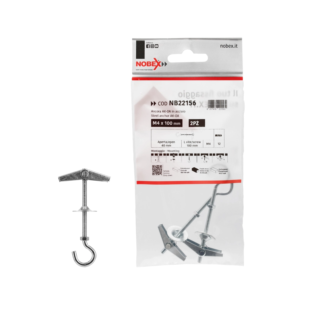 The Nobex AK-OA steel spring toggles are made of zinc-plated, corrosion-resistant steel and feature a practical open hook for hanging accessories, lamps or decorations safely and securely. The spring-loaded automatic expansion system allows the internal wings to open inside the cavity, ensuring even load distribution even on thin or perforated materials.