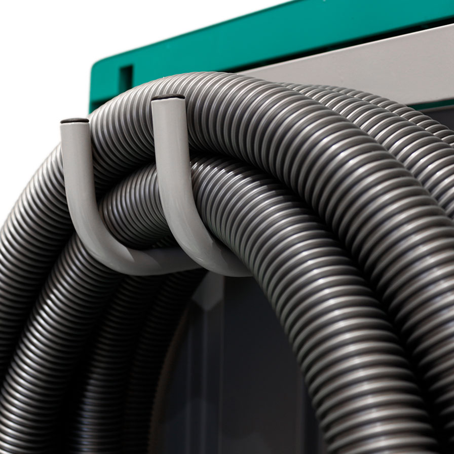The cart includes a rear basket, ideal for storing accessories and keeping everything tidy and within reach. Integrated hooks allow you to hang and transport both the flexible hose and rigid extensions, reducing clutter and making it easier to move all tools at once without handling them separately.