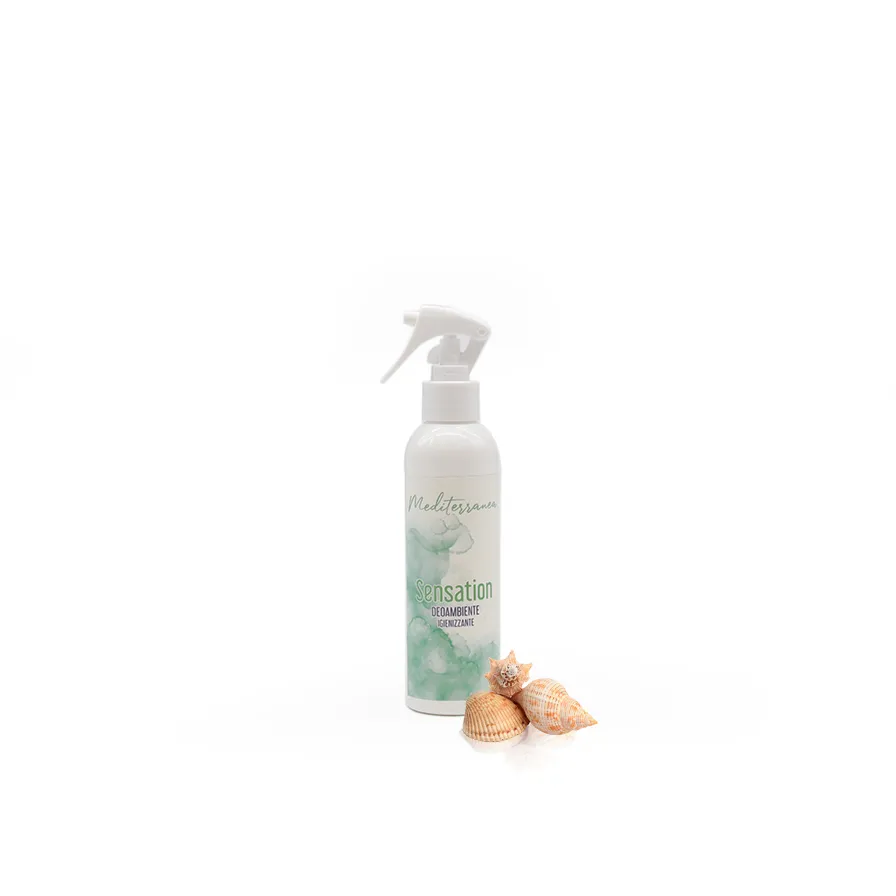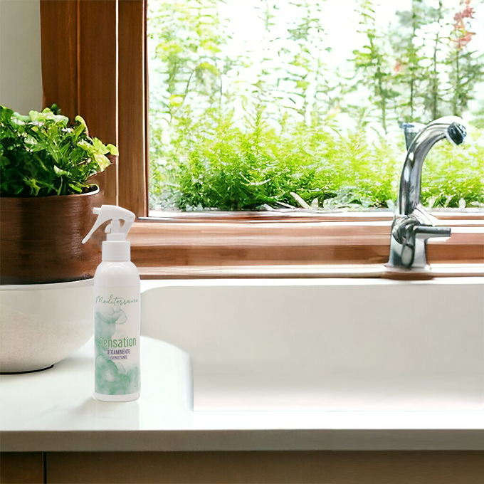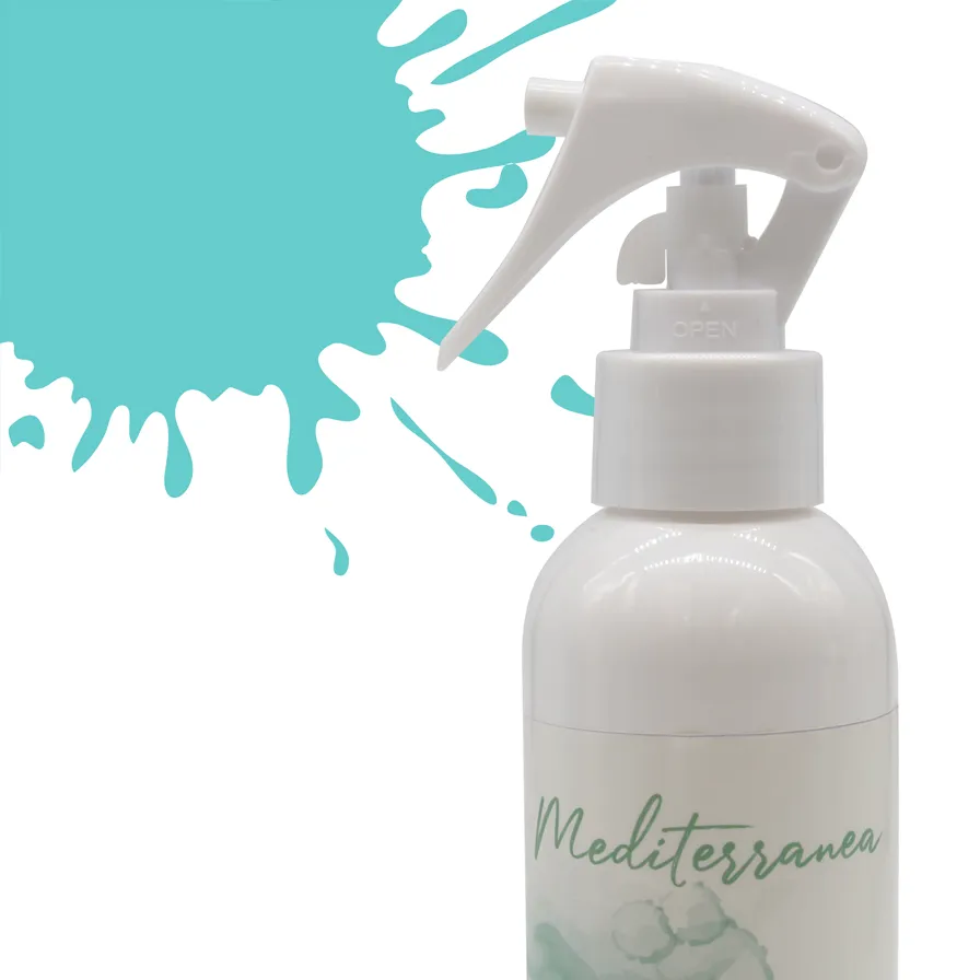 Mediterranea room freshener with thyme, rosemary and cedar. Water based, eco friendly and ideal for eliminating odours and refreshing all fabrics and rooms.