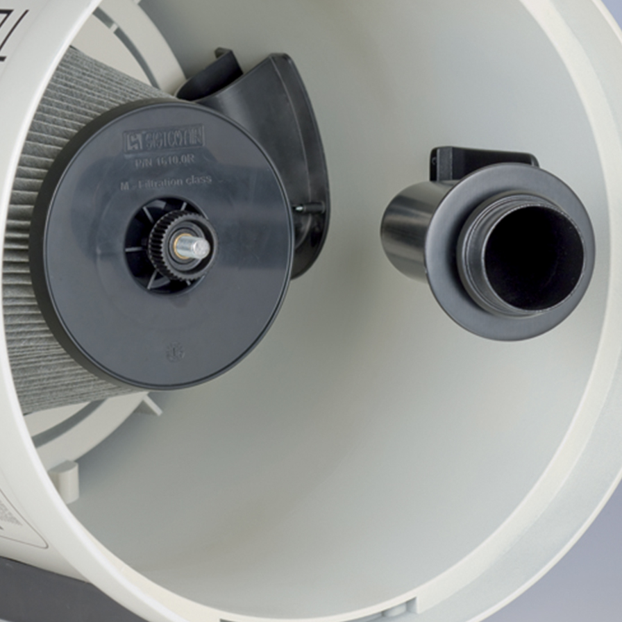 The filter cartridge for cyclonic filtration is made of washable polyester and aluminum, and is antistatic thanks to its grounding system.
